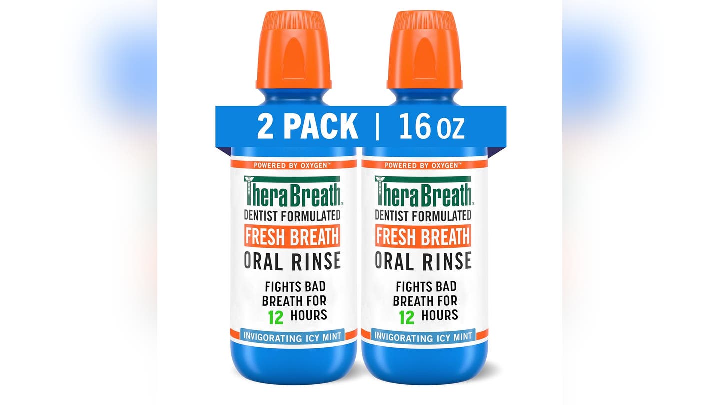Enjuague bucal de Therabreath es un enjuague bucal sin alcohol que promueve la respiración fresca con una fórmula no quemada. El enjuague bucal no contiene tintes artificiales y es vegano, kosher y sin gluten.