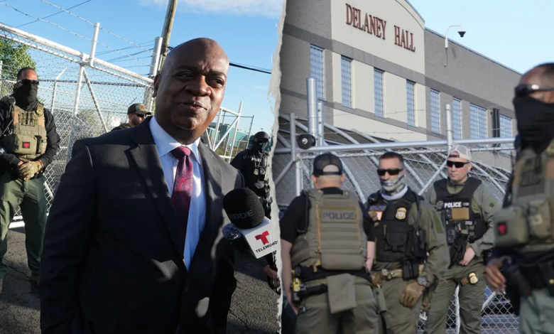 Izquierda: el alcalde demócrata de Newark, Ras Baraka, habla fuera de las instalaciones de hielo del Delaney Hall durante una protesta. Derecha: El personal de seguridad se encuentra frente a Delaney Hall, un centro de detención de inmigración recientemente reabrido, en Newark, NJ, 7 de mayo de 2025. (Getty Images | AP Photo/Seth Wenig)
