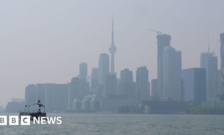 El humo de los incendios cubrió el horizonte de Toronto el lunes, donde la calidad del aire estaba entre las más bajas del mundo