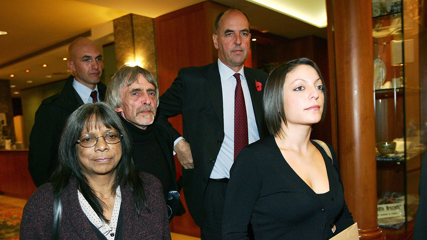 Los familiares del estudiante de intercambio británico asesinado Meredith Kercher, Stephanie Kercher (derecha), Arline Kercher (izquierda) y el padre John Kercher (centro), llegan a una conferencia de prensa en Perugia el 6 de noviembre de 2007. (STR/AFP a través de Getty Images)