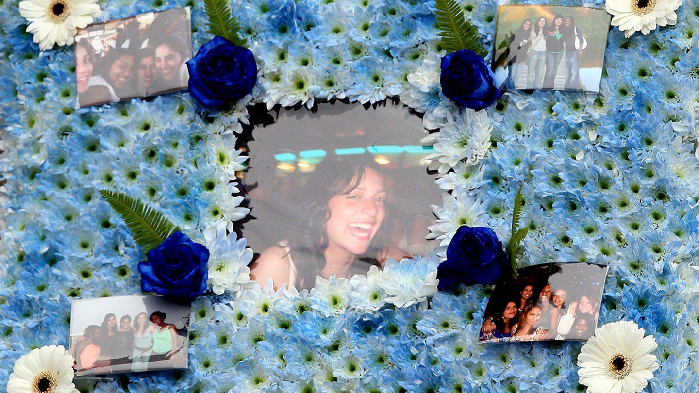 Un tributo floral con fotografías de Meredith Kercher en su funeral el 14 de diciembre de 2007 en Croydon Parish Church, South London. (Peter MacDiarmid/Getty Images)
