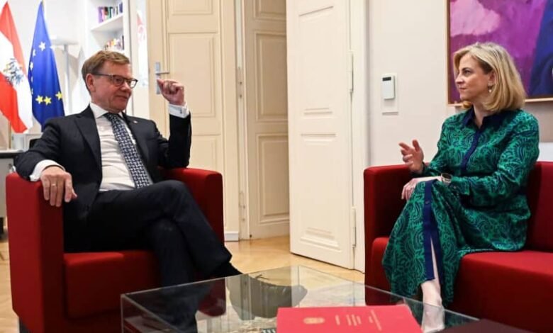 Beate Meinl-Reisinger (R), ministro de Asuntos Exteriores de Austria, recibe a Johann Wadephul (CDU), Ministro de Relaciones Exteriores federales, en el Ministerio Federal de Asuntos Europeos e Internacionales de la República de Austria. Las reuniones se centrarán en el conflicto en la Franja de Gaza y el programa nuclear iraní. Katharina Kausche/DPA