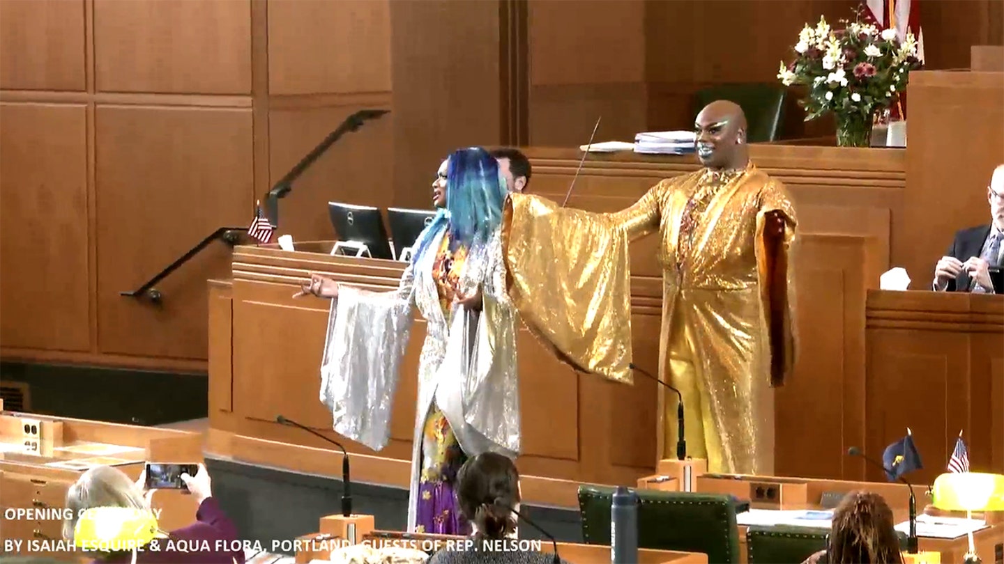 En honor al Mes del Orgullo, el representante demócrata Travis Nelson, el primer legislador afroamericano de Oregón abiertamente LGBTQ, invitó a Isaiah Esquire y Aqua Flora a actuar para la sesión ceremonia de apertura.
