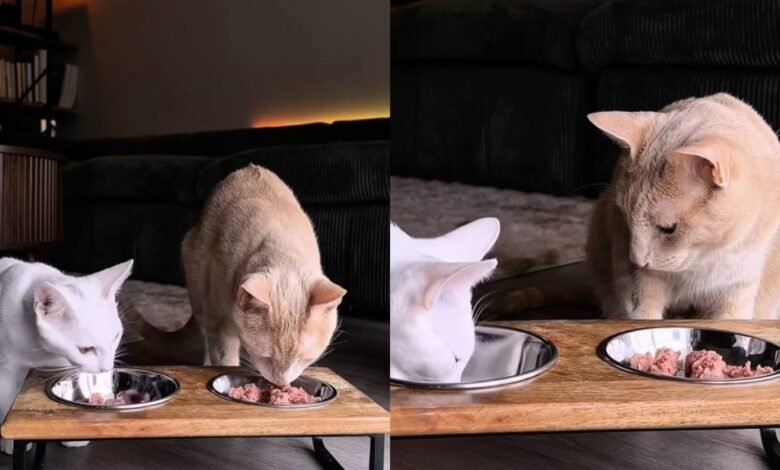 El gato no está seguro de si el hermano peludo está bien, ya que ‘inhala’ la comida en un video hilarante
