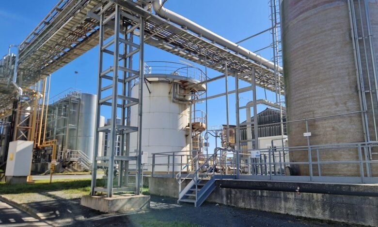 Este sitio de 40 hectáreas emplea a más de 300 personas. Una vasta colección de edificios industriales se unen por una variedad de tuberías de metal que mueven sustancias a través de los procesos.