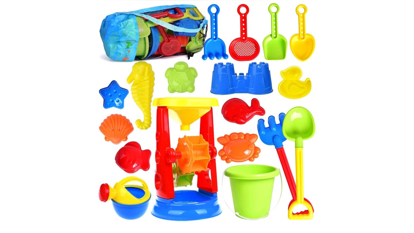 Construye castillos de arena con los niños, cavar agujeros y hacer adorables animales de arena con esto Juego de juguetes de arena de 19 piezas. El set viene con todo lo que necesita para mantener a sus hijos entretenidos una vez que terminen de nadar. Cuando haya terminado, arroje todo en la caja de transporte y listo.