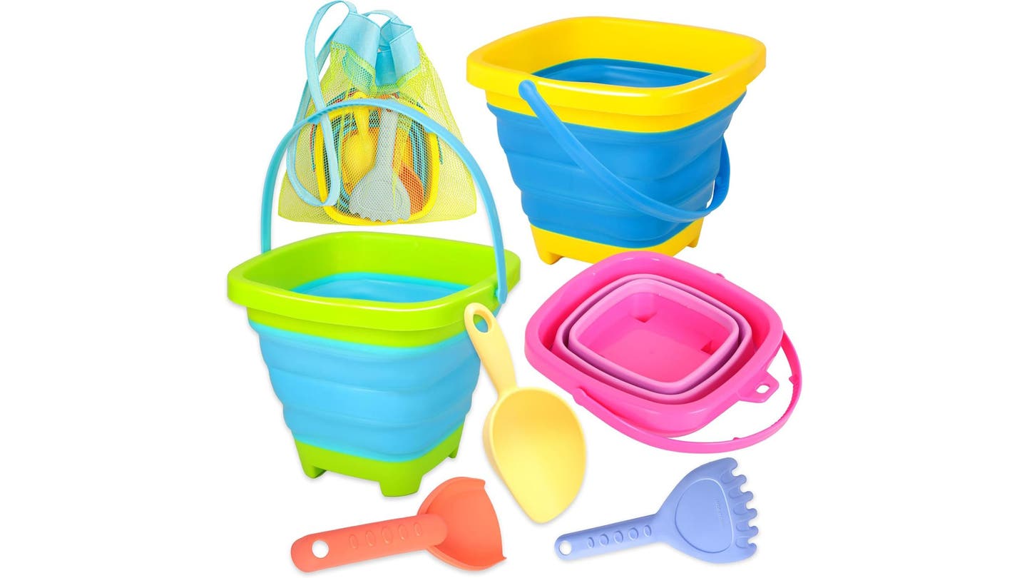 Un día de playa es perfecto para construir castillos de arena con sus hijos. Estos cubos plegables Se puede aparecer y usarse para recoger conchas, recoger arena y crear castillos de arena gigantes. Los cubos y las palas están hechos de materiales sin BPA, por lo que son seguros para niños de todas las edades.