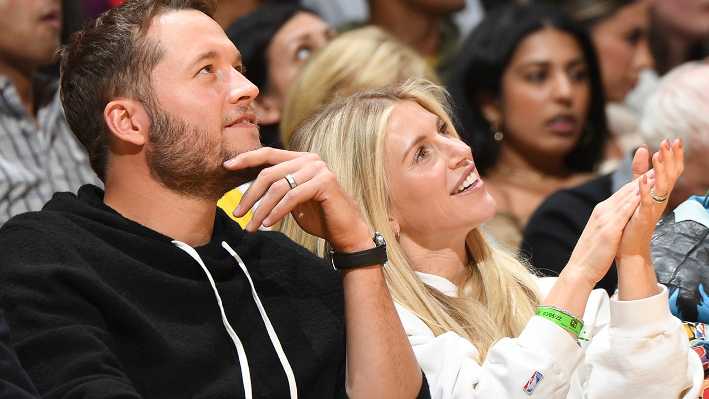 El campeón del Super Bowl, Matthew Stafford y Kelly Stafford, asisten a un juego entre los Golden State Warriors y Los Angeles Lakers el 5 de marzo de 2022, en Crypto.com Arena en Los Ángeles. (Andrew D. Bernstein/Nbae)