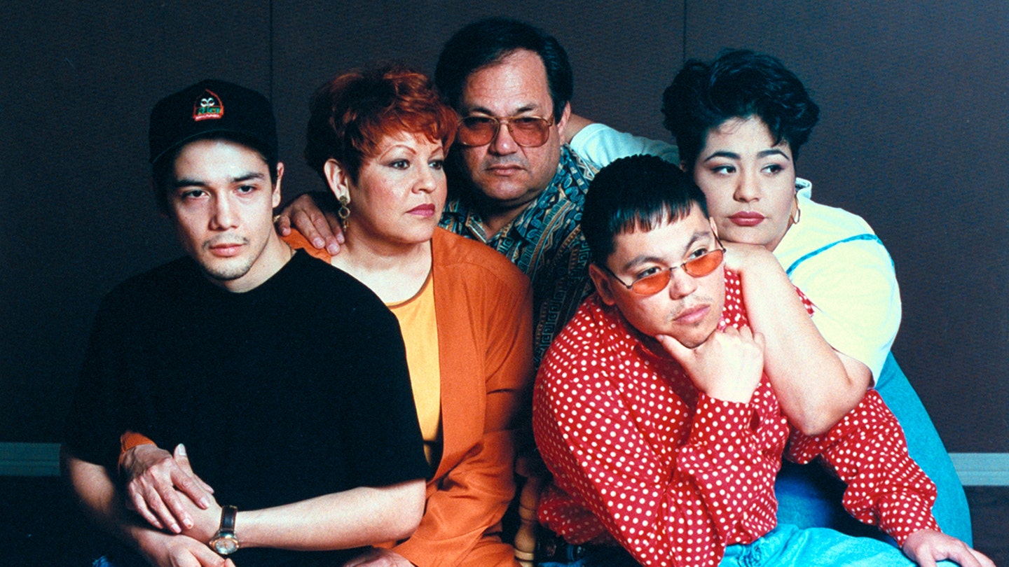 La familia del fallecido cantante de Tejano Selena, quien fue filmado por su ex presidenta del club de admiradores, Yolanda Saldivar. Desde la izquierda: el esposo Chris Pérez, los padres Marcela y Abraham Quintanilla y los hermanos AB y Suzette. (Getty Images)