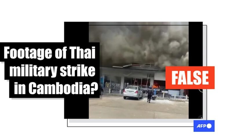 Las imágenes de un edificio en llamas y envueltas en humo muestran las secuelas de una huelga de cohetes en la provincia de Sisaket de Tailandia, al contrario de los puestos que afirman que muestra «posiciones militares de Camboya» destruidas por las fuerzas tailandesas durante los choques militares más sangrientos de los vecinos del sudeste asiático en más de una década. Los periodistas de la AFP confirmaron que el video muestra una tienda de conveniencia adjunta a una estación de servicio en la provincia de Tailandia del Nordeste, cerca de la frontera con Camboya.