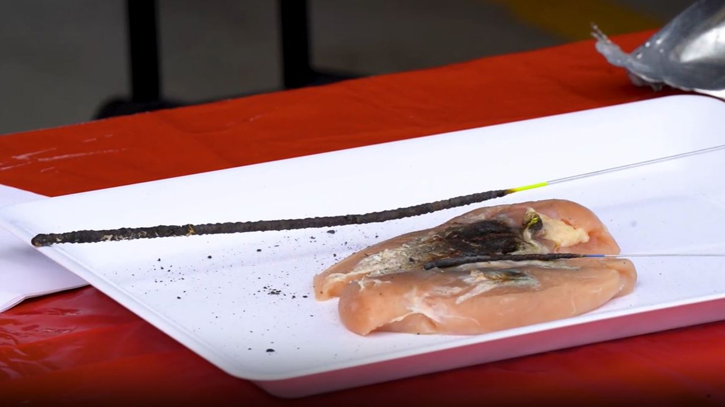 El pollo crudo se ve carbonizado después de entrar en contacto con una bengala iluminada. (Broward Health)