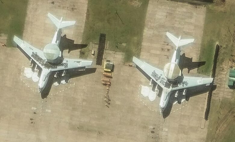 Dos aviones A-50 con neumáticos y escombros aparentes en sus alas se ven en la base aérea de Ivanono el 3 de mayo de 2025.Imagen satelital © 2025 Maxar Technologies