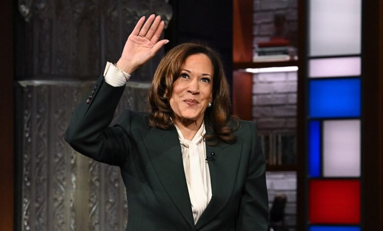 La ex vicepresidenta Kamala Harris en el show de Stephen Colbert. (Scott Kowalchyk/CBS a través de Getty Images)