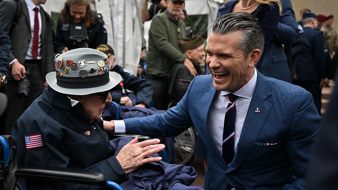 El secretario de Defensa, Pete Hegseth, habla con la Segunda Guerra Mundial de 102 años y el veterano D-Day Jake Larson, también conocido como «Papa Jake», después de una ceremonia conmemorativa en el cementerio estadounidense en Colleville-sur-Mer, noroeste de Francia, el 6 de junio de 2025. (Lou Benoist/AFP a través de Getty Images)