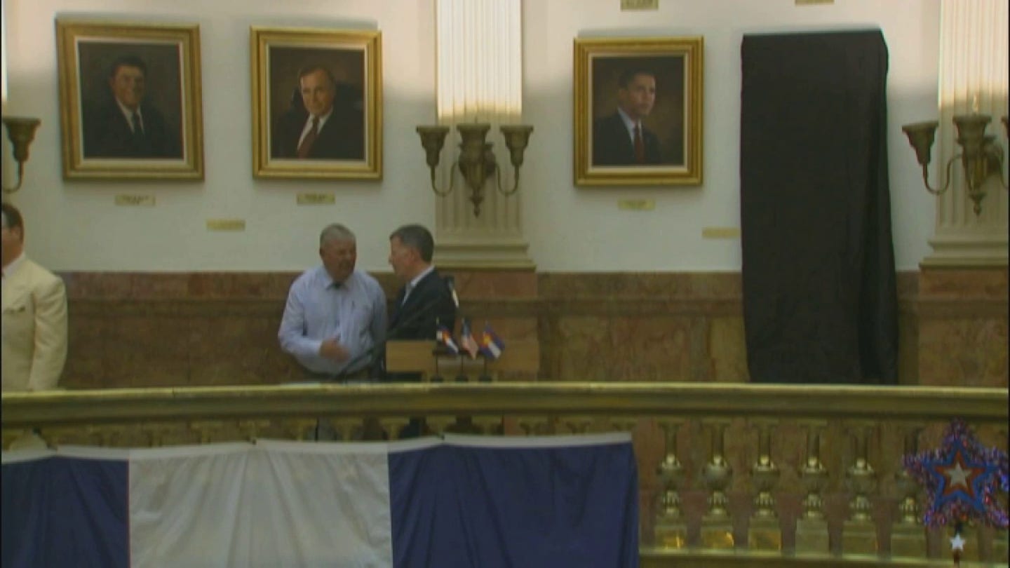 El retrato del presidente Trump se une al muro de ex presidentes dentro del Capitolio del Estado de Colorado. (Captura de pantalla/kcnc, kmgh feed)