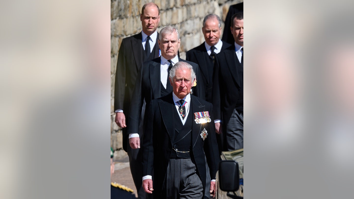El príncipe Andrew camina en la procesión por delante del funeral del Príncipe Philip en el Castillo de Windsor, Windsor, Inglaterra, el 17 de abril de 2021. (Victoria Jones/Pool a través de AP)