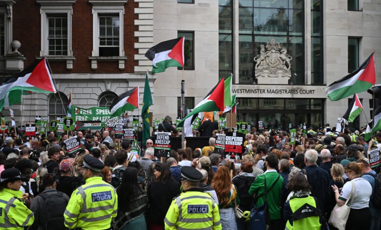 El rapero irlandés Liam Og O Hannaidh fue recibido por las multitudes que cantaban ‘Mo Chara libres’ y agitaban banderas palestinas cuando llegó a la corte de magistrados de Westminster en Londres. El miembro del trío de rap Kneecap está acusado de un delito de «terror» por presuntamente apoyar al grupo libanés Hezbolá, que niega.