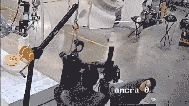 De repente, el robot comienza a agitar sus extremidades mientras los hombres intentan salir de su camino. Parece derribar un monitor de computadora, entre otros objetos, al piso durante su alboroto.