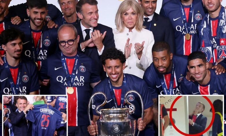 Macron dio la bienvenida al equipo de Paris Saint-Germain a la capital francesa el domingo después de que los atletas vencieron al Inter de Milán por 5-0 el sábado por la noche, elevando el trofeo de la Liga de Campeones por primera vez en la historia del club.