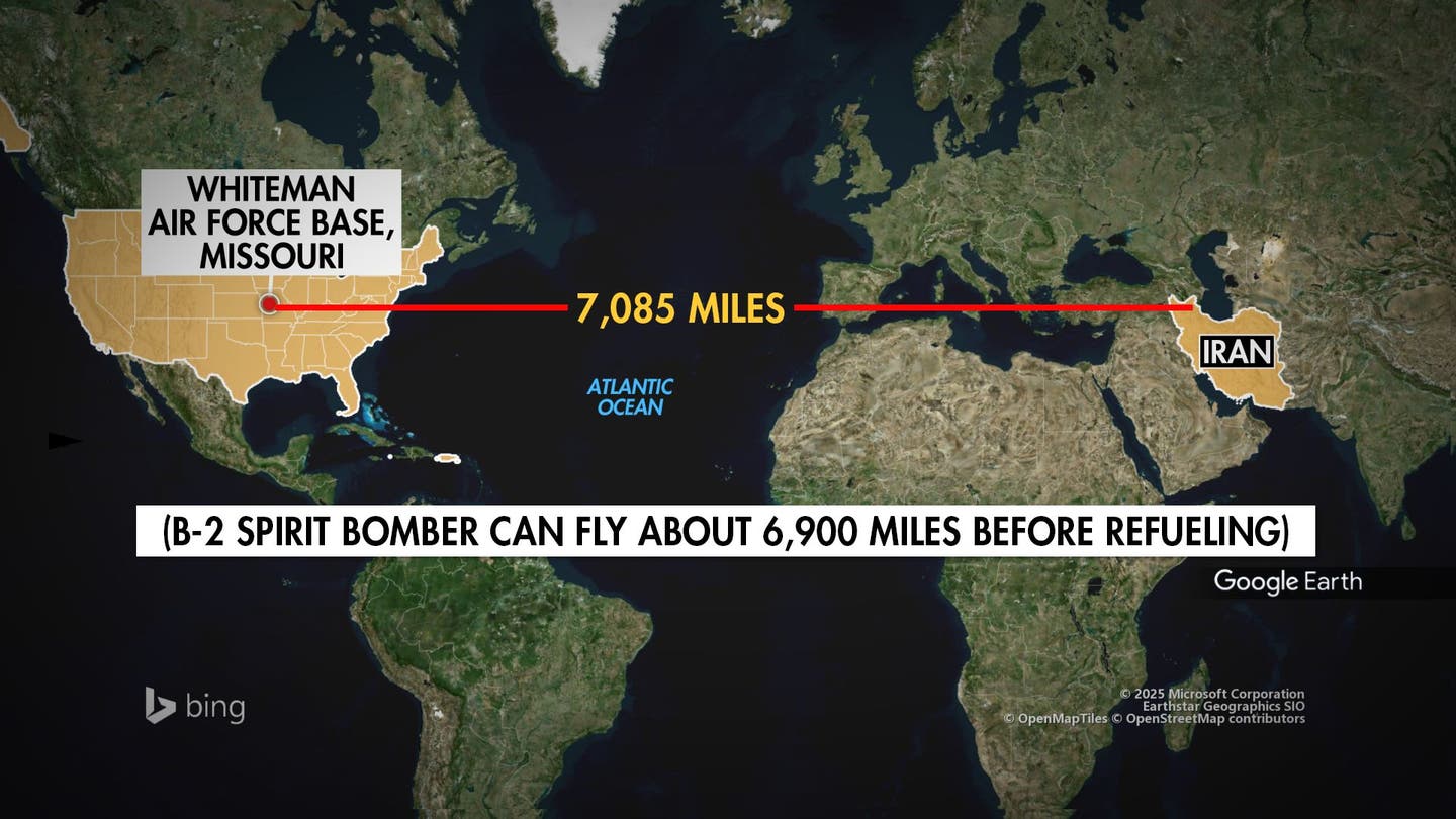 Un mapa muestra la distancia desde Whiteman AFB a Irán. (Fox News)