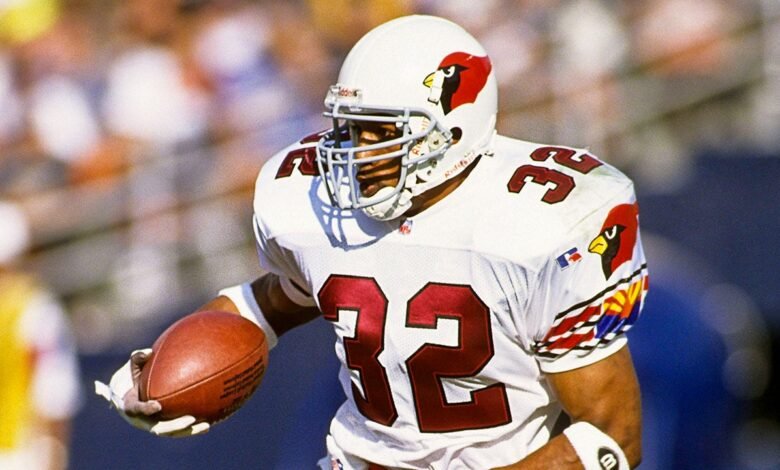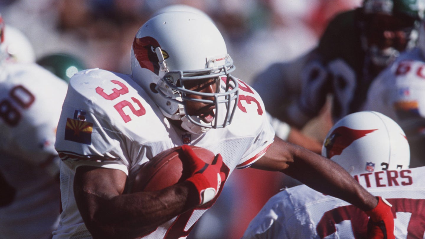 El corredor Lehon Johnson de los Cardenales de Arizona corre con el balón durante una derrota por 31-21 ante los Jets de Nueva York en el Sun Devil Stadium en Tempe, Arizona. (Stephen Dunn/Allsport)