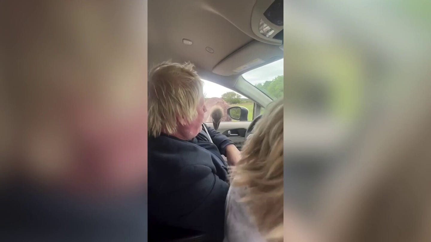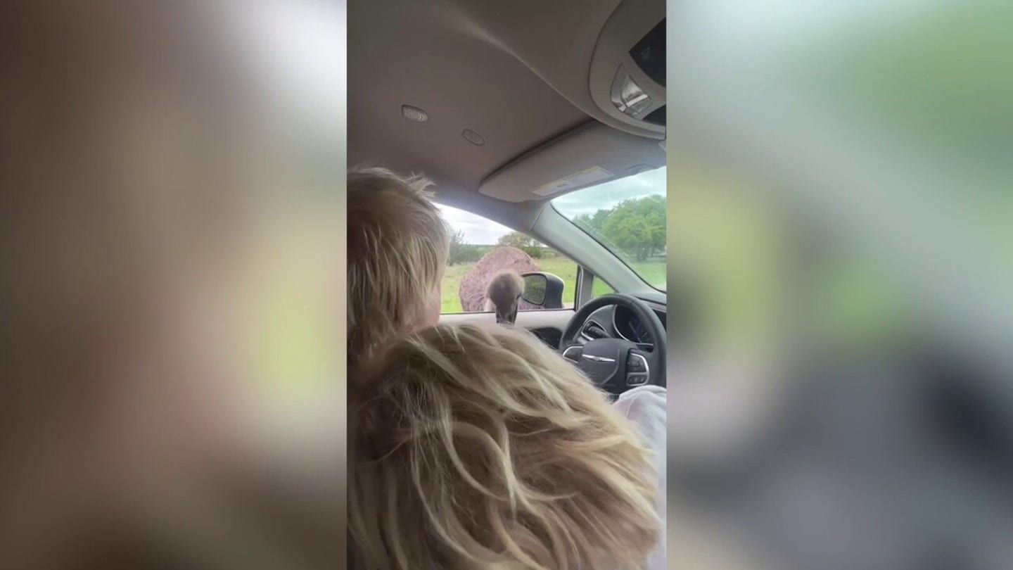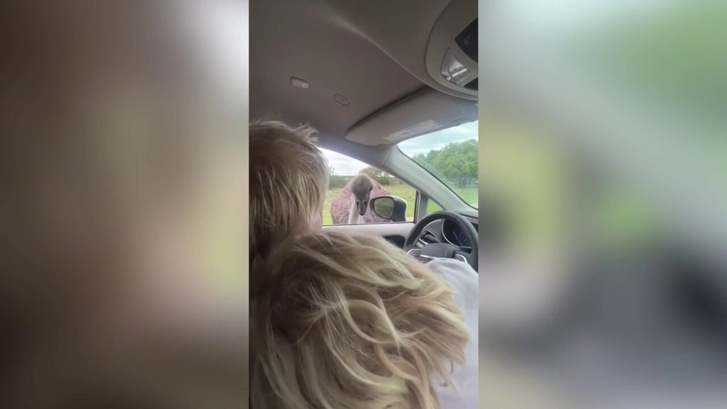 El metraje muestra a Johnson sacando la mano del auto y aparece llamar el avestruz mientras uno de sus tres hijos se inclina hacia la ventana. Se ve al animal metiendo su cuello en el auto antes de morder a Johnson, posiblemente en la mano.