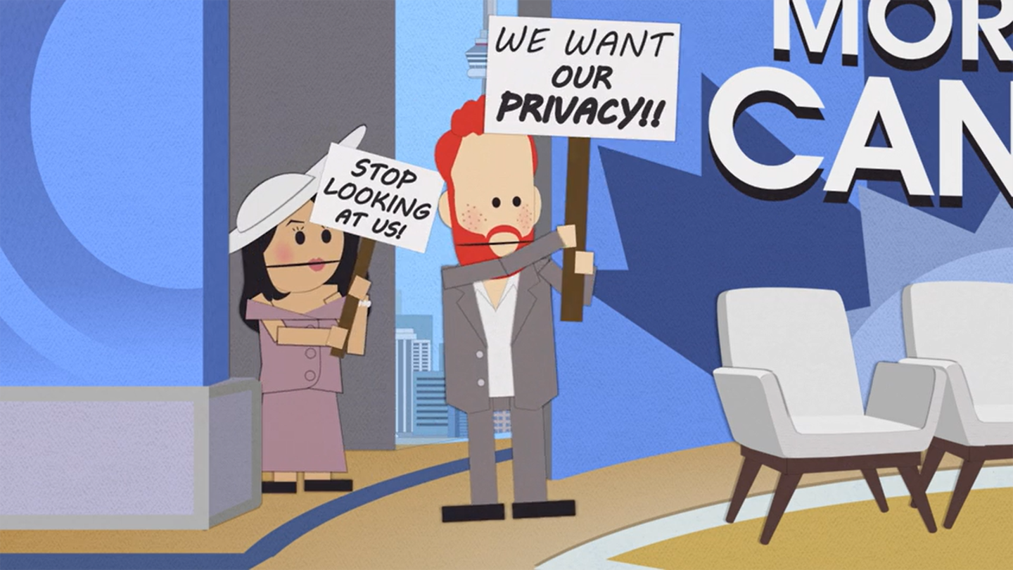 Meghan Markle y el príncipe Harry tienen señales que le piden al público que respete su privacidad en un episodio de 2023 de «South Park». (Comedia Central)