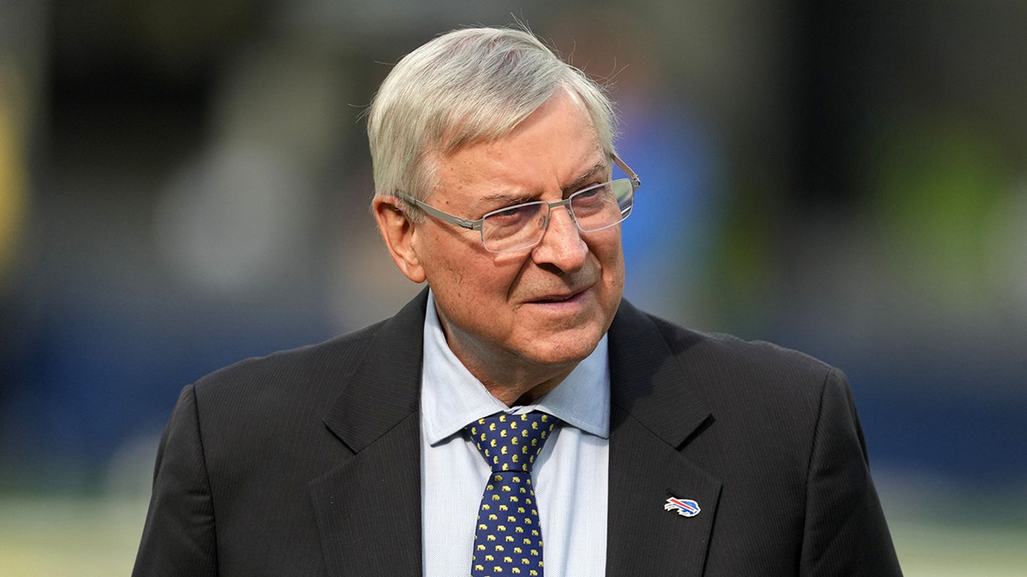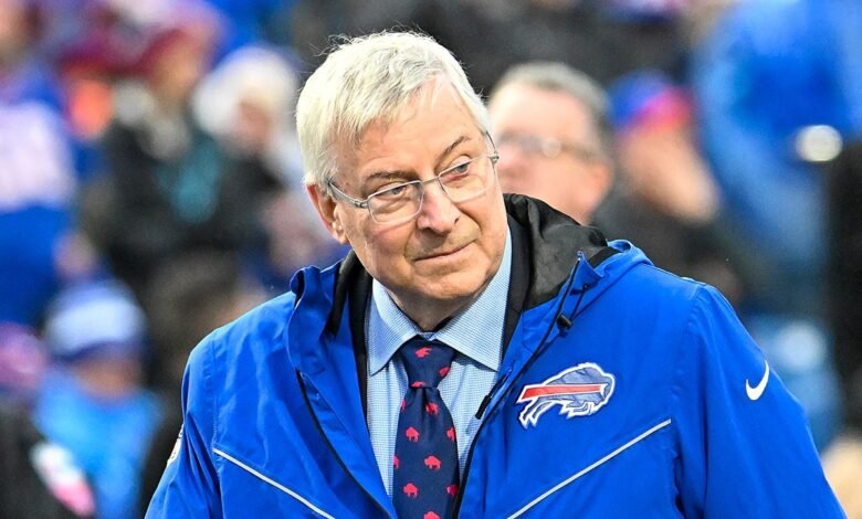 El propietario de Buffalo Bills, Terry Pegula, camina con el equipo antes de un partido contra los Jets de Nueva York en el Highmark Stadium el 29 de diciembre de 2024. (Mark Konezny/Imágenes de Imagn)