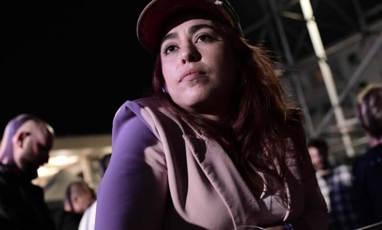 La ex rehén Ilana Gritzewsky habla durante un rally que pide el lanzamiento de israelíes celebrados por los terroristas de Hamas en Gaza, en » Hosage Square » en Tel Aviv, 8 de marzo de 2025. (Crédito: Avshalom Sassoni/Flash90)