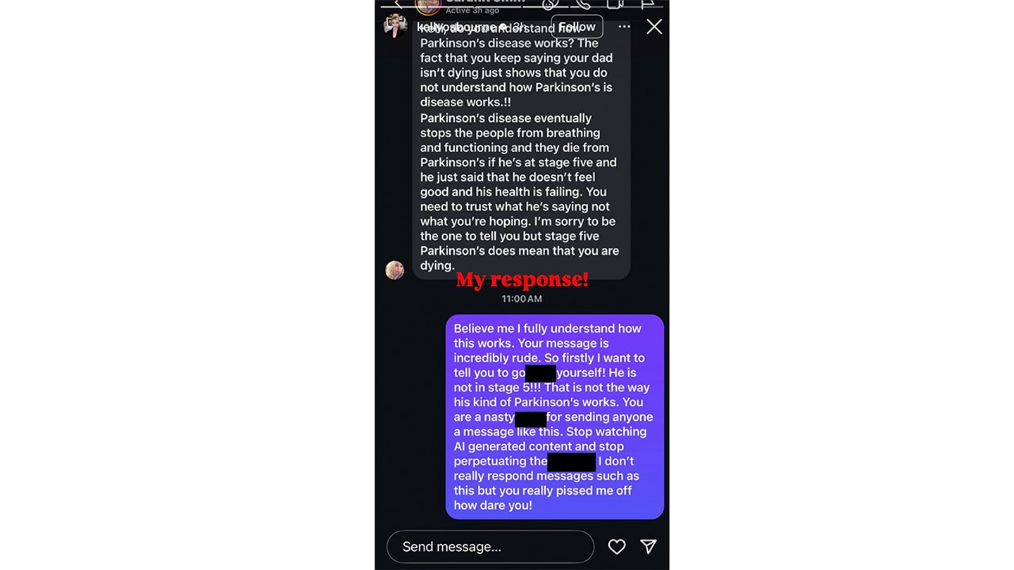 «No se está muriendo», enfatizó ella. «Sí, él tiene Parkinson, y sí, su movilidad es completamente diferente de lo que solía ser, pero no está muriendo. ¿Qué te pasa?»