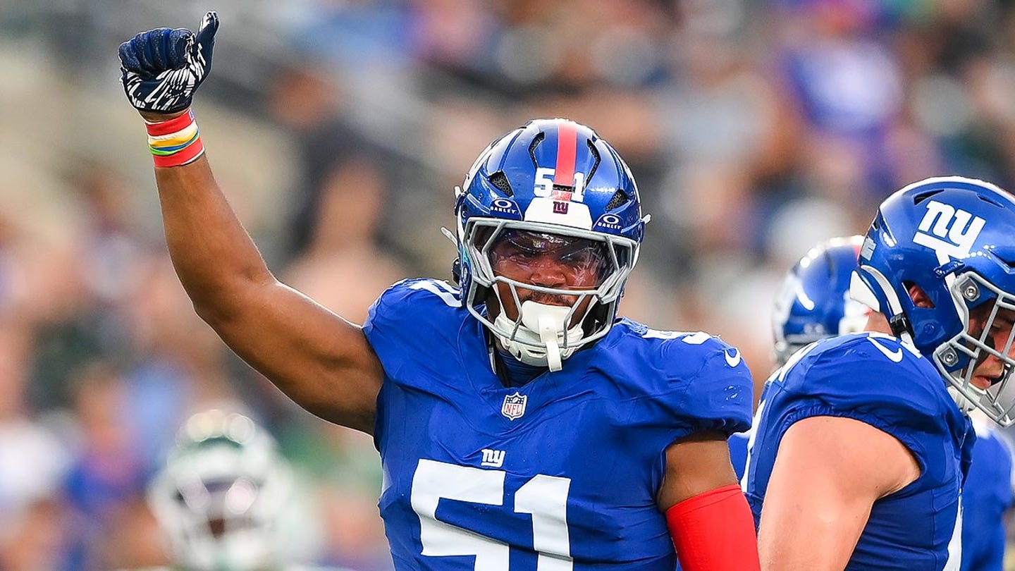 El apoyador de los New York Giants, Abdul Carter, reacciona a una jugada contra los Jets de Nueva York durante la primera mitad en el MetLife Stadium. (Imágenes Rich Barnes/Imagn)