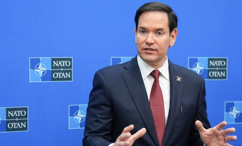 El secretario de Estado, Marco Rubio, se dirige a la audiencia durante una conferencia de prensa final como parte de la reunión de ministros de asuntos exteriores de la OTAN en la sede de la OTAN en Bruselas el 4 de abril. (Jacquelyn Martin/Pool/AFP a través de Getty Images)