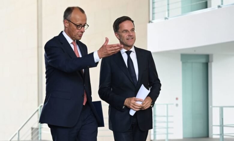 El canciller alemán Friedrich Merz (R) y el secretario general de la OTAN Mark Rutte hablan durante una conferencia de prensa en la cancillería después de su reunión. Soeren Stache/DPA