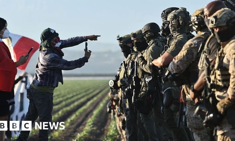 Mientras tanto, los agentes de inmigración dispararonGas a una multitud de unos 500 manifestantes, que se habían reunido para detener las redadas fuera de dos granjas legales de cannabis. Algunos arrojaron rocas, y el FBI dice Uno disparó un arma a los agentes federales.