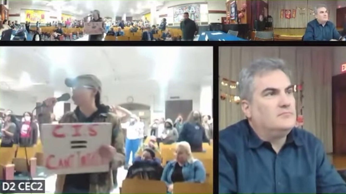 Jo Vitale mantuvo una señal y habló en oposición a los activistas. (Distrito CEC 2 a través de YouTube)