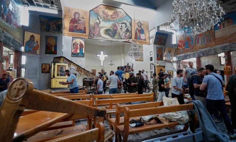 Los ciudadanos y las fuerzas de seguridad sirias inspeccionan el daño dentro de la Iglesia de Mar Elias, donde un terrorista suicida se detonó en Dweil’a en las afueras de Damasco, Siria, el domingo 22 de junio de 2025. (Photo AP/Omar Sanadiki)