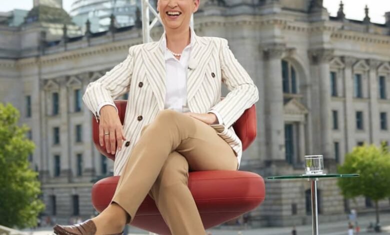 La líder del partido alternativa para Alemania (AFD), Alice Weidel, llega para la entrevista de verano ARD «de Berlín» frente al edificio Reichstag. Joerg Carstensen/DPA