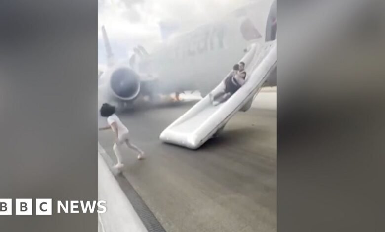 Las imágenes de las redes sociales muestran el momento en que los pasajeros usaron diapositivas de emergencia para escapar, con llamas vistas debajo del avión.