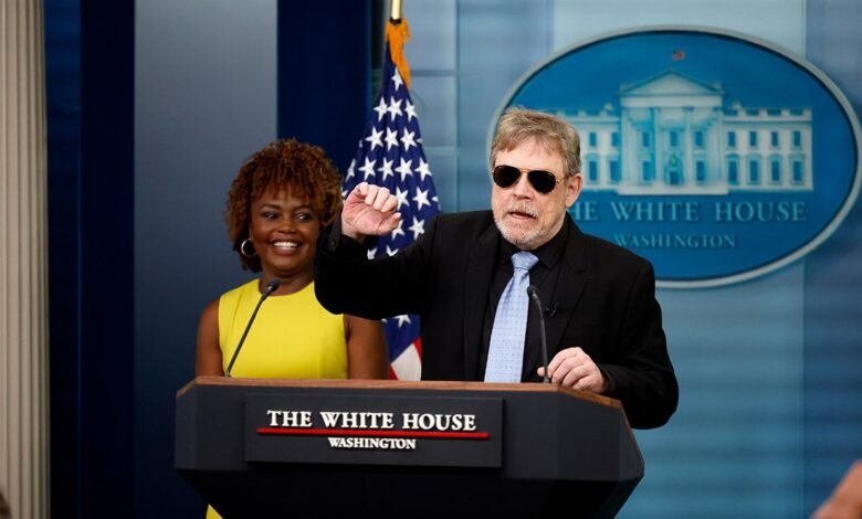 Hamill fue uno de los principales partidarios de Biden durante la presidencia de Biden y, en mayo de 2024, se reunió con el presidente en la Oficina Oval y se detuvo en la sala de informes de la prensa con la secretaria de prensa Karine Jean-Pierre. (Getty Images)