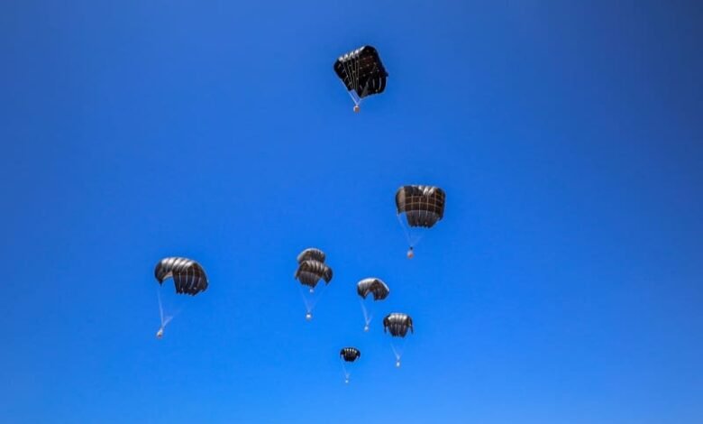 Los suministros de ayuda humanitaria están en aire acondicionado sobre la tira de Gaza. La ayuda humanitaria se dejó caer en la tira de Gaza desde el aire durante el quinto día consecutivo el jueves, con paletas de comida en paracaídas en la zona costera bloqueada en medio de una crisis mortal de hambre. Abed Rahim Khatib/DPA