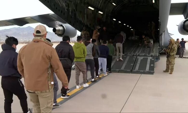 Los migrantes ilegales se alinean en un avión militar para regresar a Ecuador. El viernes, un juez federal detuvo los esfuerzos de la administración Trump para enviar ocho migrantes a Soutd Sudán. (Fox News)