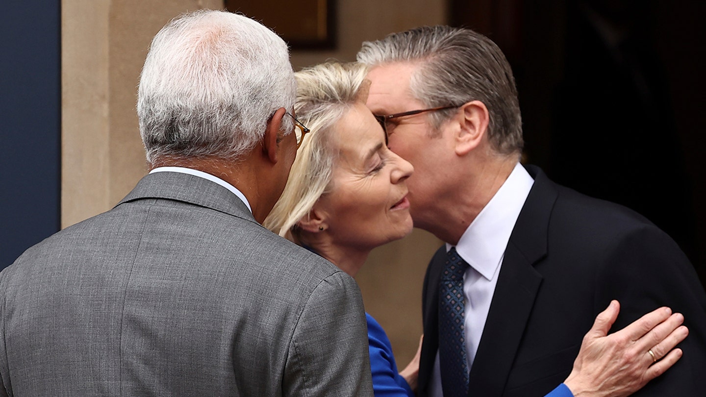 El primer ministro de Gran Bretaña, Keir Starmer, derecho, presidenta de la Comisión Europea de Kisses, Ursula von der Leyen, cuando llega con el presidente del Consejo Europeo, Antonio Costa, para asistir a una cumbre del Reino Unido y la Unión Europea en Lancaster House, Londres, lunes 19 de mayo de 2025. (Henry Nicholls/Pool Photo a través de AP)