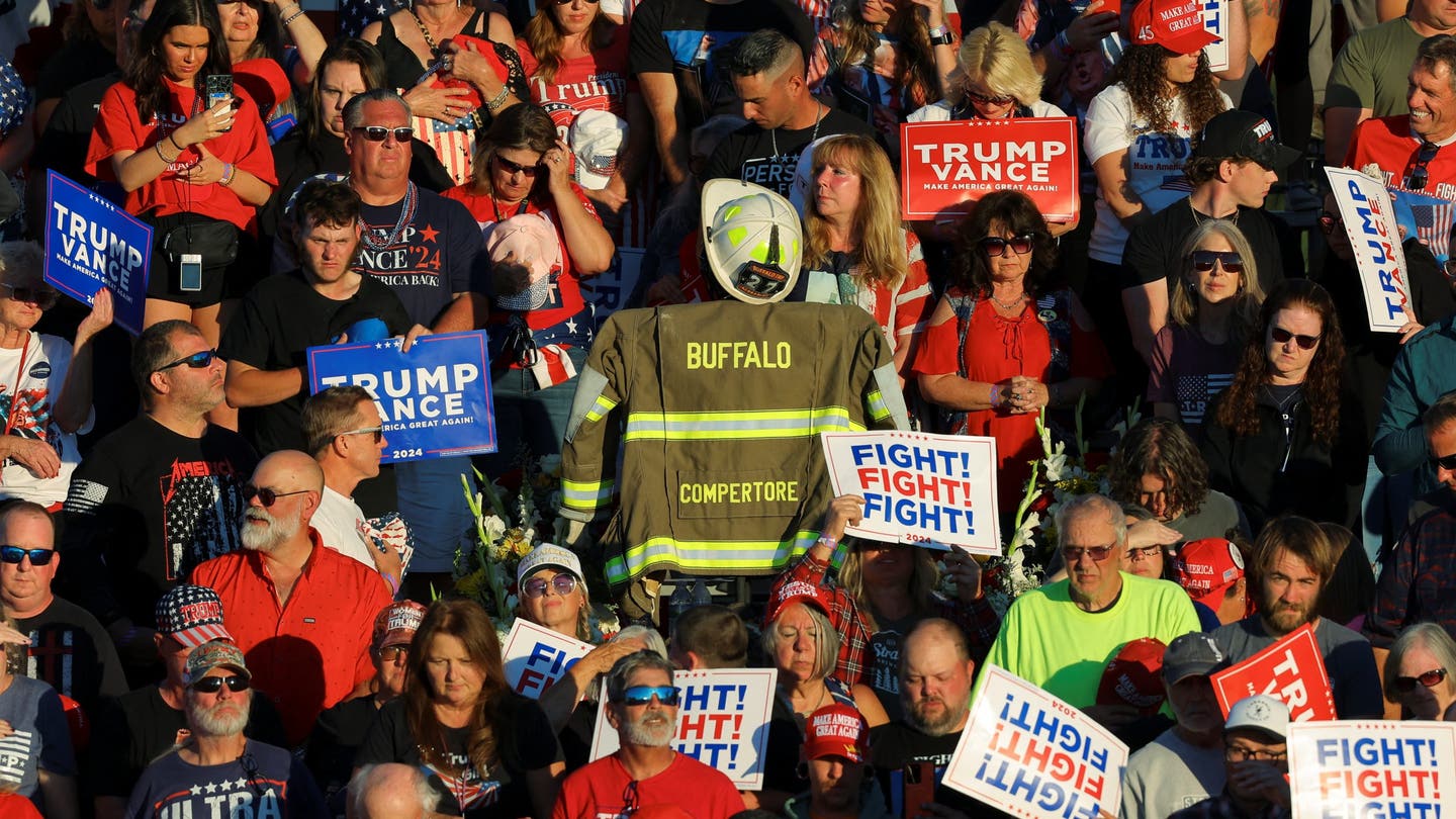 La capa de participación de Corey Compreratore, un jefe retirado del Departamento de Bomberos Voluntarios que fue asesinado a tiros en el intento de asesinato de julio contra el candidato presidencial republicano y el ex presidente de los Estados Unidos, Donald Trump, se ve en las gradas durante un momento de silencio durante una manifestación, en Butler, Pennsylvania, 5 de octubre de 2024. (Reuters/Carlos Barria)