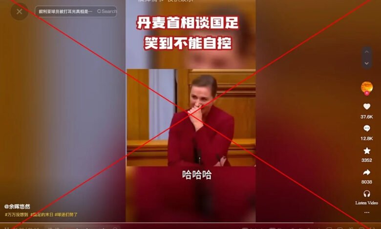 El video muestra a los fanáticos del fútbol chino cantando «¡tan vergonzoso!» Antes de cortar al primer ministro danés Mette Frederiksen hablando en el Parlamento.