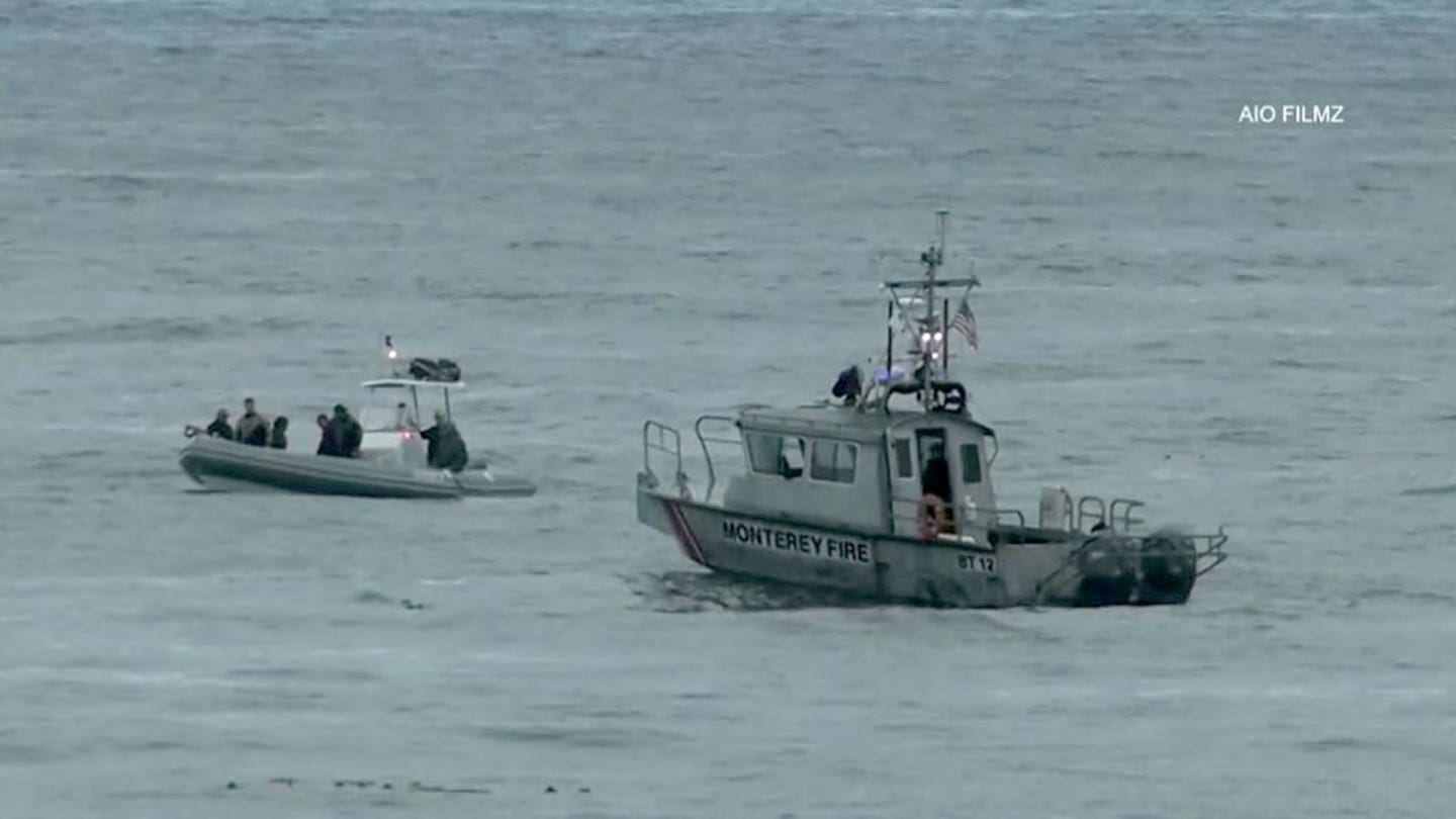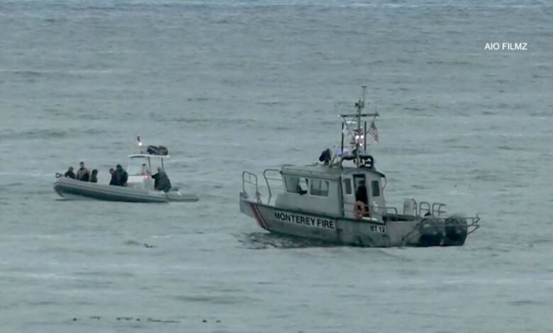 Una tripulación de botes de bomberos de Monterey busca en las aguas a las víctimas de un pequeño accidente aéreo en el condado de Monterey, California, el domingo 27 de julio de 2025. (Película de AIO)