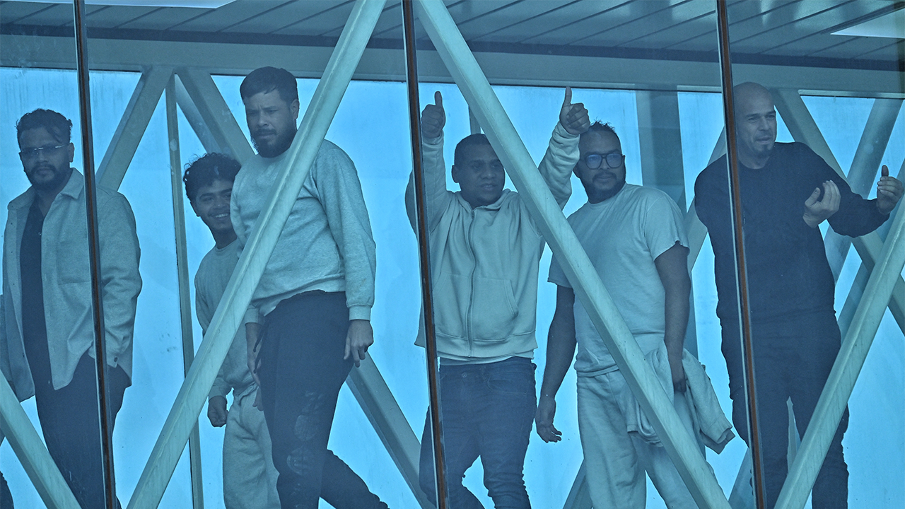 Los migrantes venezolanos repatriaron del gesto de los Estados Unidos vistos a su llegada al aeropuerto internacional Simon Bolivar en Maiquetia, Venezuela, el 4 de abril de 2025. (Juan Barreto/AFP a través de Getty Images)
