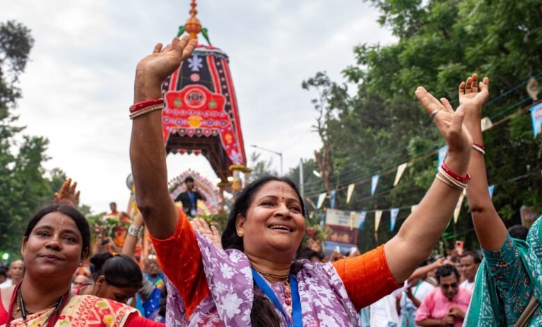 El momento, capturado por docenas de cámaras y transmitido ampliamente en la televisión, el 27 de junio, marcó el lanzamiento del primer Rath Yatra patrocinado por el gobierno del Estado Oriental yatra («Festival Chariot») para celebrar la construcción de un complejo de templo extenso construido para albergar al Dios hindú, Lord Jagannath.