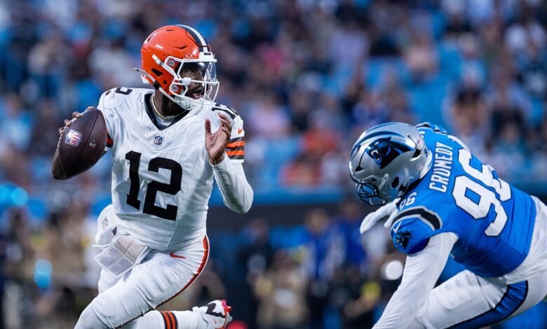 El mariscal de campo de los Cleveland Browns Shedeur Sanders (12) en la línea de scrimmage en el tercer trimestre en el Bank of America Stadium el 8 de agosto de 2025 en Charlotte, Carolina del Norte. (Imágenes Bob Dannan / Imagn)