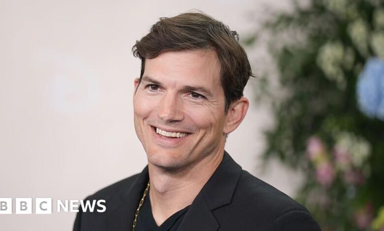 Getty Images Una toma de cabeza y hombros de Ashton Kutcher en la que mira la cámara y sonríe. Tiene una chaqueta oscura y una cadena de oro alrededor de su cuello. Getty Images