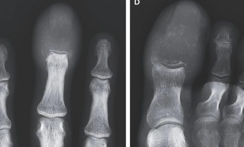 Pero las radiografías revelaron la verdad aterradora: ambos huesos fueron borrados por lesiones líticas, con tumores que reemplazan completamente la estructura ósea en las puntas del dedo y el dedo del pie.